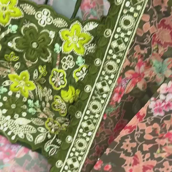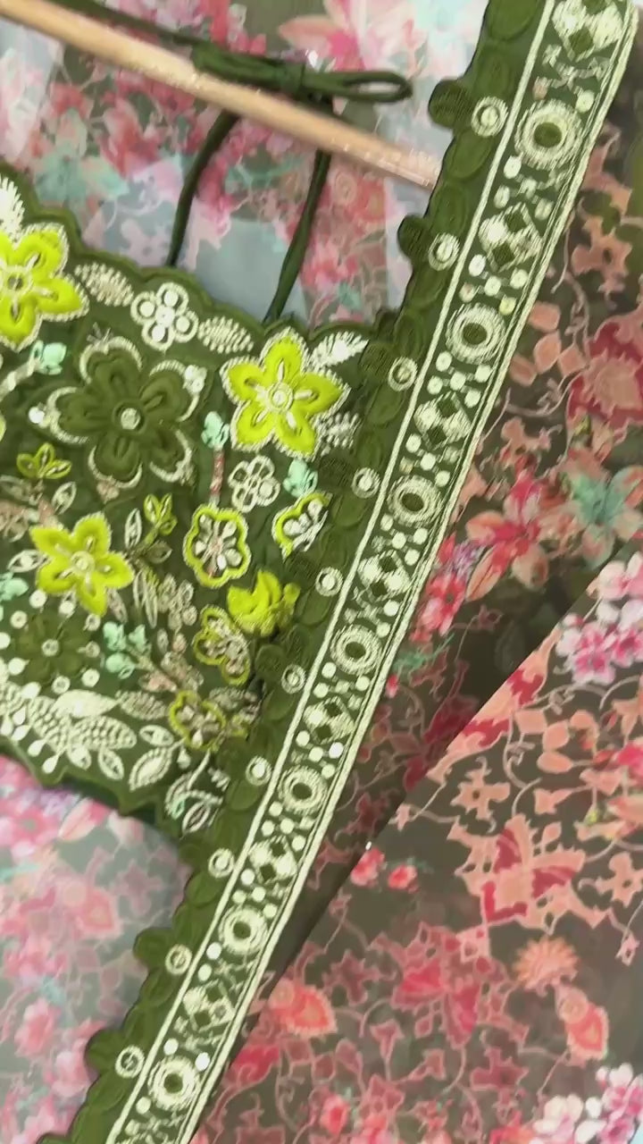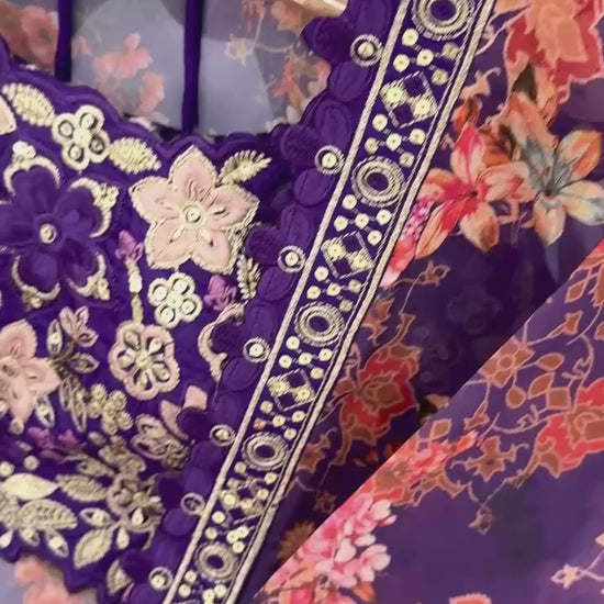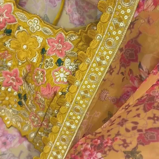 Koti (Jacket): Heavy Faux Georgette with vibrant floral digital print, embellished with 5mm sequence embroidery work. Full sleeves for a graceful Indo Western touch. (Length: 49-50 inch | Sizes: S-XXL | Fully Stitched)